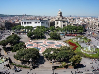 Plaça de la ciutat, de grans proporcions. Constitueix el punt d’unió entre el nucli vell (per la Rambla i l’avinguda del Portal de l’Àngel) i el nou (pel carrer de Fontanella, les rondes, el passeig de Gràcia, la rambla de Catalunya, els carrers de Vergara i de Pelai). Té el caràcter alhora de zona d’esplai, de comunicació (punt de confluència de línies d’autobús, de metros i de ferrocarrils) i de serveis (bancs, grans magatzems).