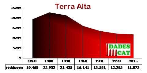 POBLACIÓ: La població és escassa. La comarca està en vies de despoblament a causa de l’èxode rural iniciat a partir del 1920, moment en què havia assolit el màxim poblacional. Aquesta regressió demogràfica ha afectat tots els municipis de la comarca; l’any 1996, dels dotze municipis que la conformaven, sis no arribaven als 1.000 h, i cap dels altres no sobrepassava els 3.000 h. Aquesta dinàmica demogràfica, amb uns saldos migratoris negatius perllongats durant pràcticament tot el segle XX, ha fet de la Terra Alta una de les comarques amb una estructura per edats més envellida de tot Catalunya.
