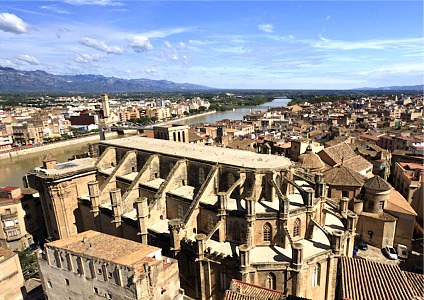 ART.- L’interior de la catedral, construïda als segles XIV i XV, és d’estil gòtic. La façana, inacabada, és un mur imponent d’estil barroc amb fornícules, columnes salomòniques i una cornisa enorme. Una de les capelles laterals és la de la Mare de Déu de la Cinta, barroca, decorada amb marbres de colors i pintures de Dionís Vidal. També hi ha un retaule gòtic de pedra policromada (segle XIV) a l’altar major, obra de l’italià Francesco d’Oberto, i el retaule de la Transfiguració de l’escola de Jaume Huguet (segle XV). El claustre, també gòtic, és d’una gran simplicitat; s’hi pot accedir des del carrer per una portalada barroca, construïda al començament del segle XVIII. El col·legi de Sant Lluís, obra de l’arquitecte tortosí Joan Anglès, és un solemne edifici renaixentista i plateresc, fet bastir per Carles I l’any 1544. Un altre important edifici civil és el palau episcopal, edificació gòtica de la primera meitat del segle XIV. També és gòtica la façana de la casa consistorial, tot i ésser construïda vers el 1545. De les antigues fortificacions que defensaven la ciutat, que també tenia drassanes, només resta el castell de la Suda.
