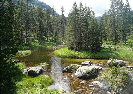 Després del salt d’Aigoestortes, passa pels banys de Tredòs i, ja més encaixat, aconsegueix el riu de Ruda.