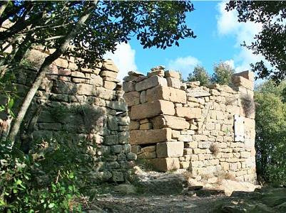Castell roquer en ruïnes, de la vall d’Hostoles, al cim del turó de Colltort (845 m alt), a l’extrem oriental de la serra del Corb.