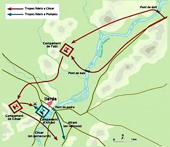 L’avantguarda de Cèsar, sota el comandament de G. Favi, va creuar el Pirineu, va establir el seu campament aigües amunt del Segre i construí dos ponts per assegurar-se l’avituallament. La crescuda del riu va destruir un dels ponts i afavorí les escaramusses dels pompeians, tot i que Favi va aconseguir salvar la situació.