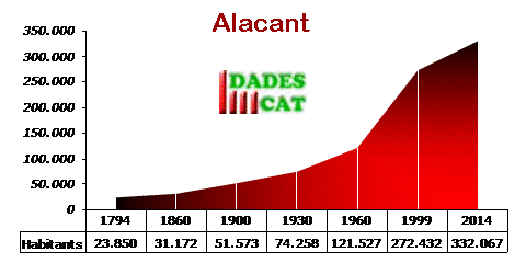 POBLACIÓ.- A mitjan segle XIX (1860) només tenia 31.000 habitants, el 1900 pujaven a 50.000, i el 1960 n’allotjava 122.000, part dels quals vivien escampats en petits pobles a l’horta. El creixement demogràfic de la ciutat ha estat molt ràpid i motivat principalment per l’activitat del port, les funcions administratives, la indústria i el turisme.