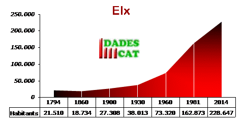 POBLACIÓ I ECONOMIA.- L’evolució demogràfica s’ha mantingut ascendent ja des de començament del segle XVIII i s’ha accelerat les darreres dècades. Més de la meitat de la superfície del terme és conreada, amb predomini del regadiu (ametllers, cítrics, palmeres, hortalisses, etc), molt expandit i mecanitzat. L’altre gran motor de l’economia és la indústria de la pell i del calçat, de llarga tradició; s’hi afegeixen el turisme i l’estiueig.