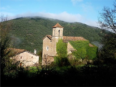 Masia, església i caseria, a la dreta de la riera de Merlès.
