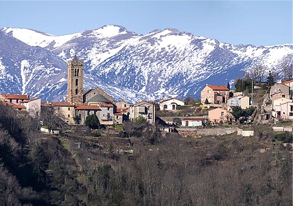 El poble es troba emplaçat a la partió d’aigües entre la Muga i el Tec, en un ample coll; l’església parroquial de Santa Maria és romànica (segle XII), amb una sola nau i n’és molt notable la portalada, precedida d’un vestíbul, amb arquivoltes esculpides amb decoració vegetal i d’animals fantàstics.
