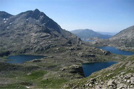 Grup d’estanys (estany Superior -2.360 m alt- i Inferior de la Pera -2.310 m-), al vessant meridional de la línia de crestes que separa Andorra de la Cerdanya (colls de Claror i de Perafita).
