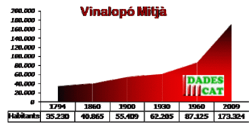 POBLACIÓ.- Des del punt de vista demogràfic, al llarg del segle XX, tots els municipis de la comarca han tingut un saldo positiu, especialment intens a partir del decenni del 1950; en el conjunt de la comarca, la incorporació, a principis del decenni del 1990, de la comarca de les Valls del Vinalopó, incrementà les xifres de població de manera significativa. En l’actualitat, la comarca comprèn un total d’onze municipis, set dels quals sobrepassen la xifra dels 5.000 h, amb una forta concentració als municipis més industrialitzats, com Novelda, Elda, Petrer, Monòver i Asp, i una tendència al despoblament dels pobles petits i rurals.