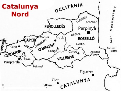 (o Catalunya del Nord) Nom donat a la part dels Països Catalans dependent de l’estat francès: 4.116 km2, 457.238 hab (2013).